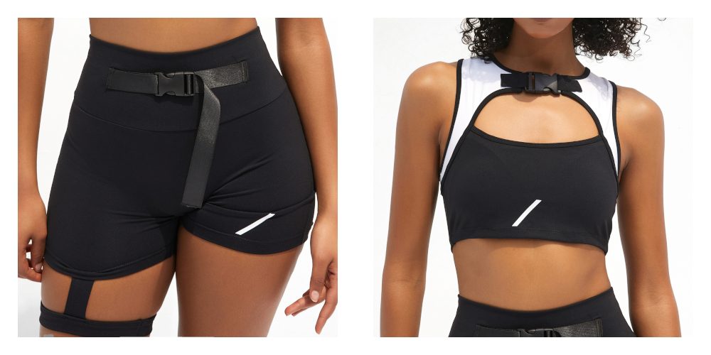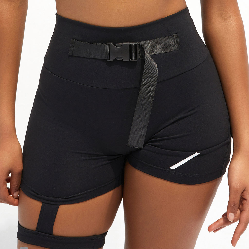 The sporty Bike-slash-Gym shorts boast a supportive elevated waistband, medium thigh coverage, butt lift derriere ruching with cheeky perk-accentuating single-button pockets, and asymmetric right leg and buckle and strap embellishment for Y2K urban chic, perfect for those who Fear to be Ordinary™. Perfect for intensive spin class, city cycling, outdoor rides.. whatever.