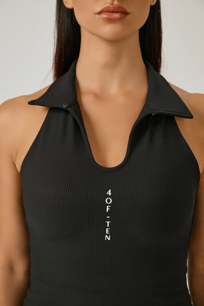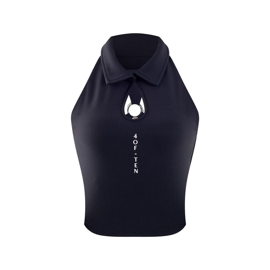 Stand out from the crowd with our Collar Bra Tank, featuring a unique racerback metal ring and polo collar design. Made with soft ribbed fabric, this medium-impact tank is perfect for studio-to-street transitions. Inspired by the fear of being average, this one-of-a-kind piece deserves applause.